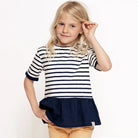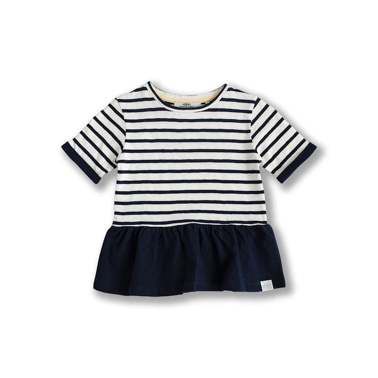 Randig kortärmad barntop i ebbe’s klassiska rand med uppvik i ärmslut och skärning i midja.