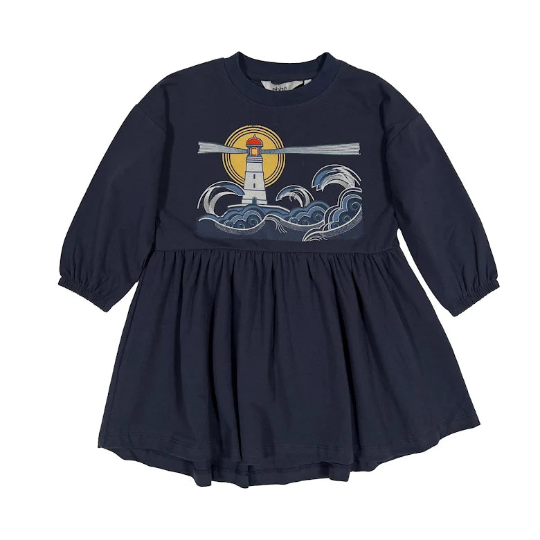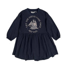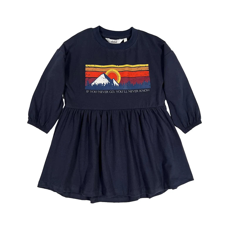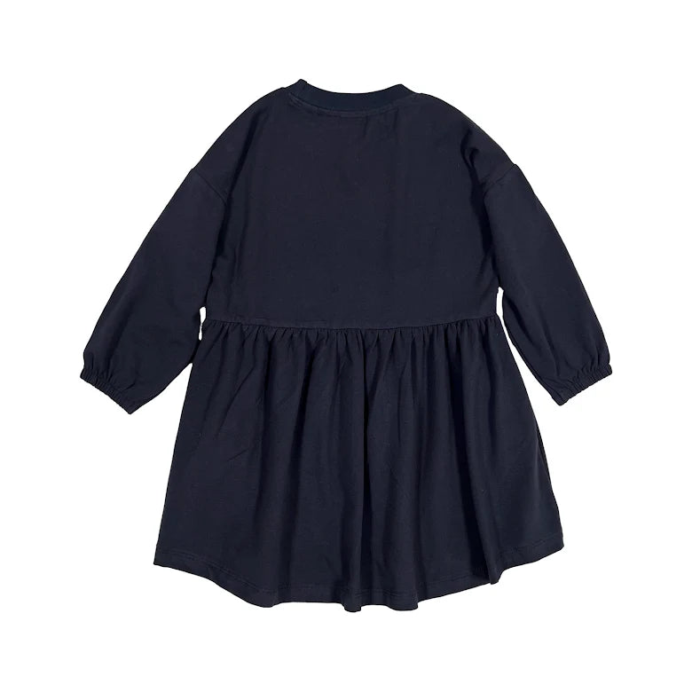 Långärmad klänning till barn med voluminös vidd i nedre del som ger ett fint "snurr". Dekorativt tryck framtill och rund halslinning. Avslappnad och bekväm passform, matcha med leggings eller strumpbyxor för en fin vardagslook. Detta plagg ingår i vårt hållbarhetskoncept Rescue Collection med fokus på att eliminera tygsvinn och värna om de människor som tillverkar kläderna.