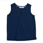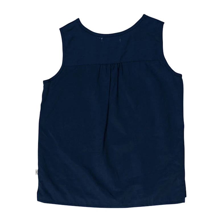 Ärmlös topp med liten sprund längst ner i sidorna. Dekorativ ögla vid halsringningen fram och veck baktill. Fint och miljövänligt tyg tillverkat av lyocell. Levereras i dubbelstorlekarna: 86/92, 98/104, 110/116, 122/128, 134/140, 146/152, 158/164.