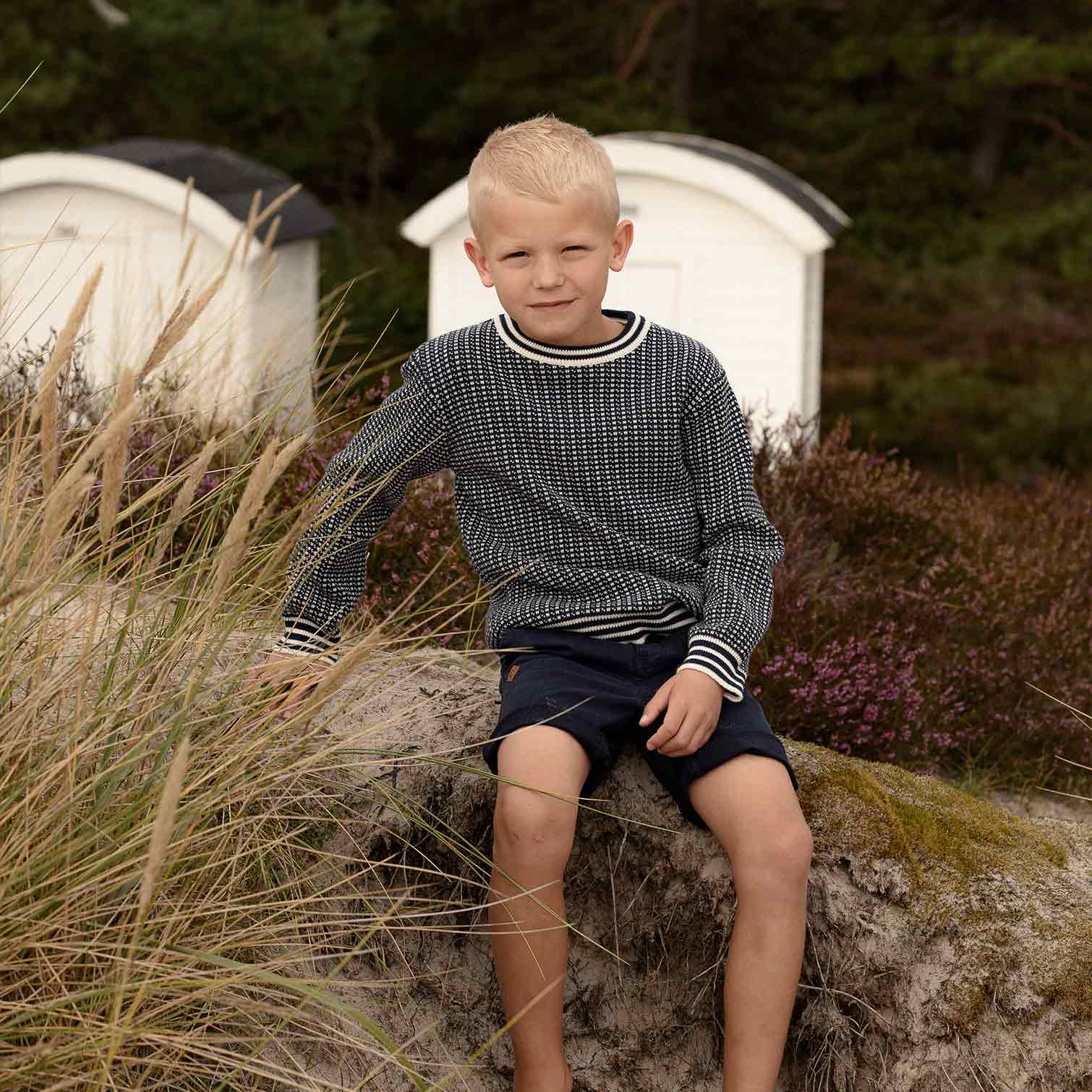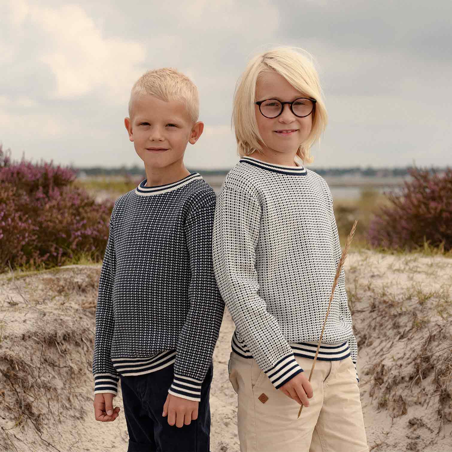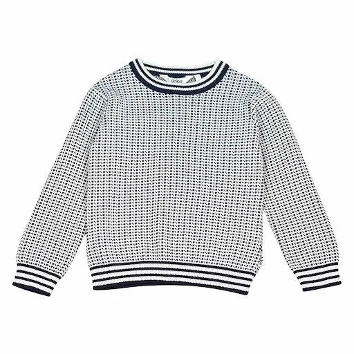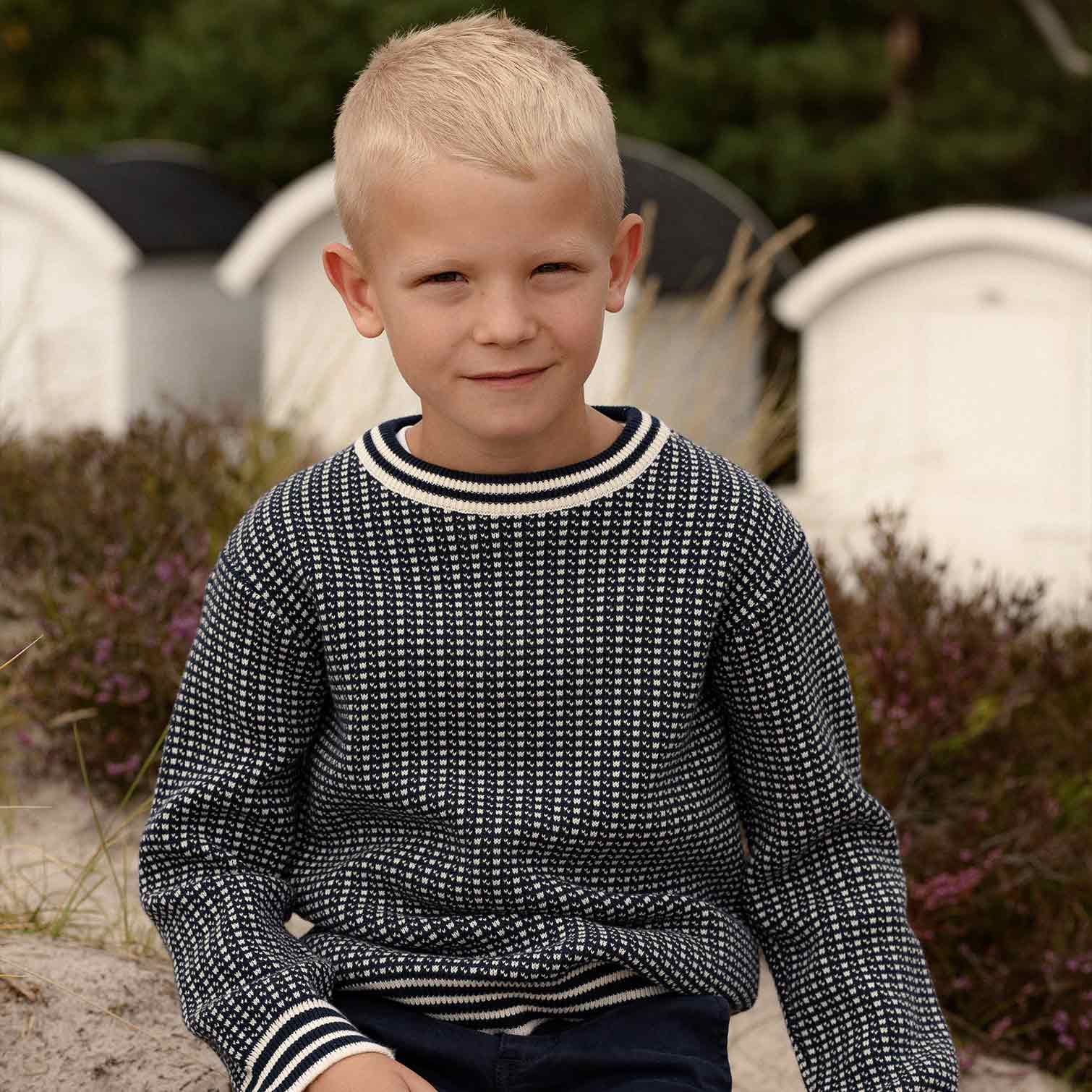 Klassisk Fiskartröja/Islendertröja till barn. Tröjan är stickad i 100% ekologisk bomull med ett klassiskt mönster som för tankarna till havet. Tillgänglig i två olika färgställningar; vit på blå eller blå på vit. Hållbart tillverkad i 100% ekologisk bomull.