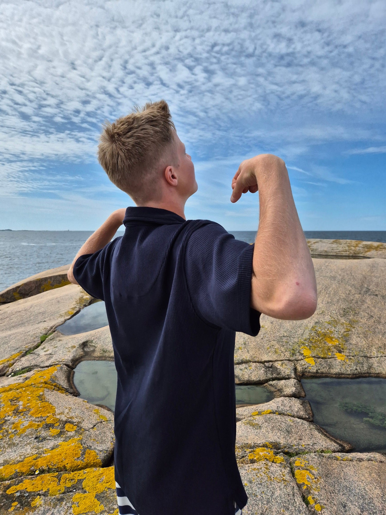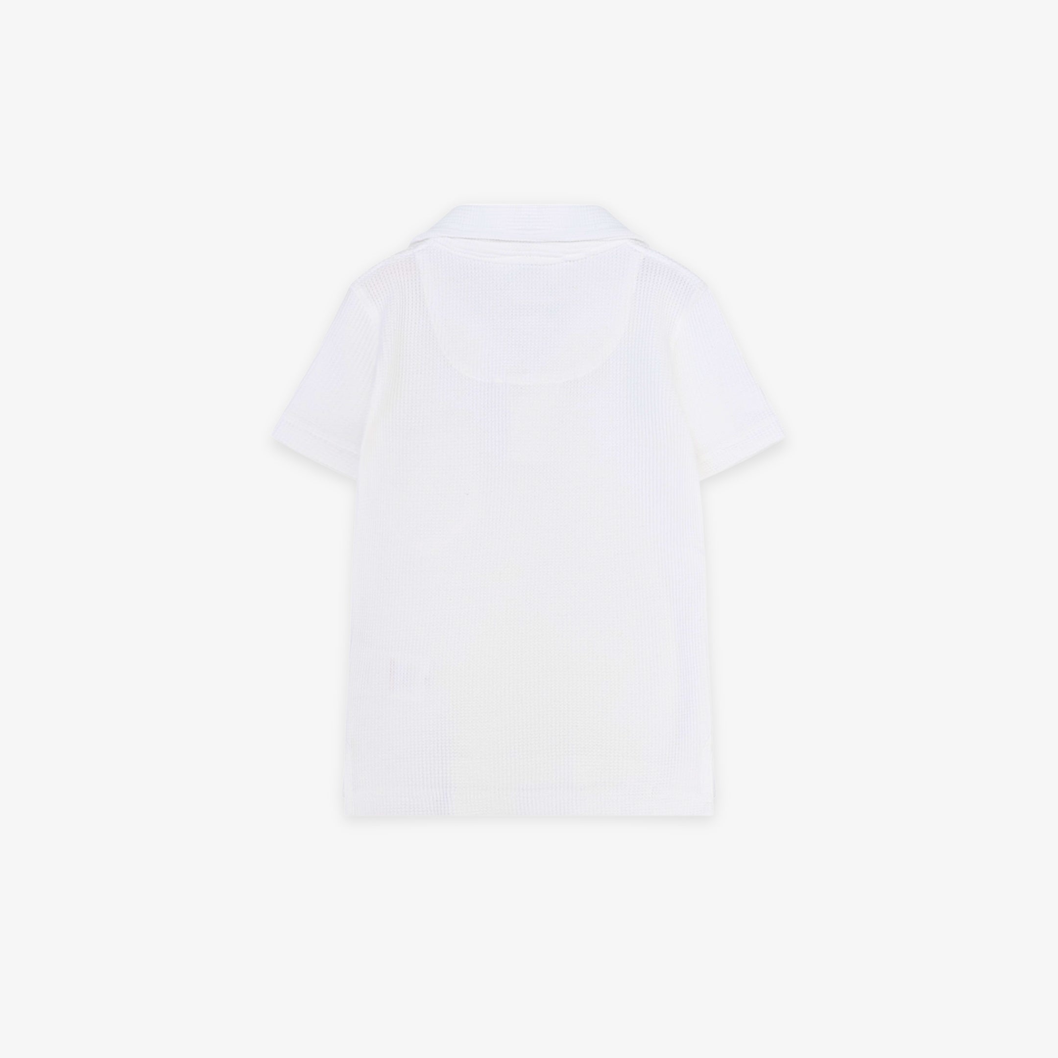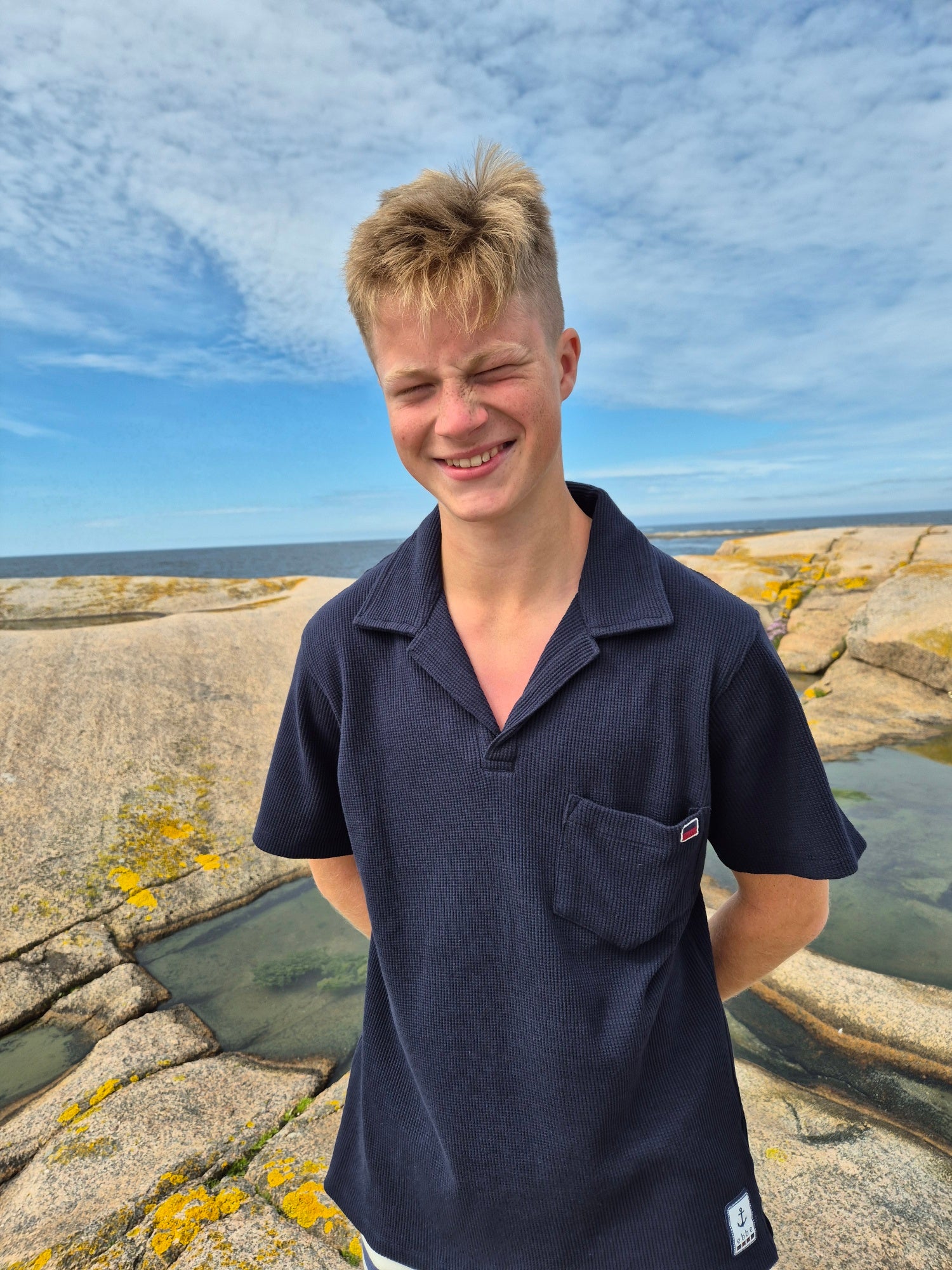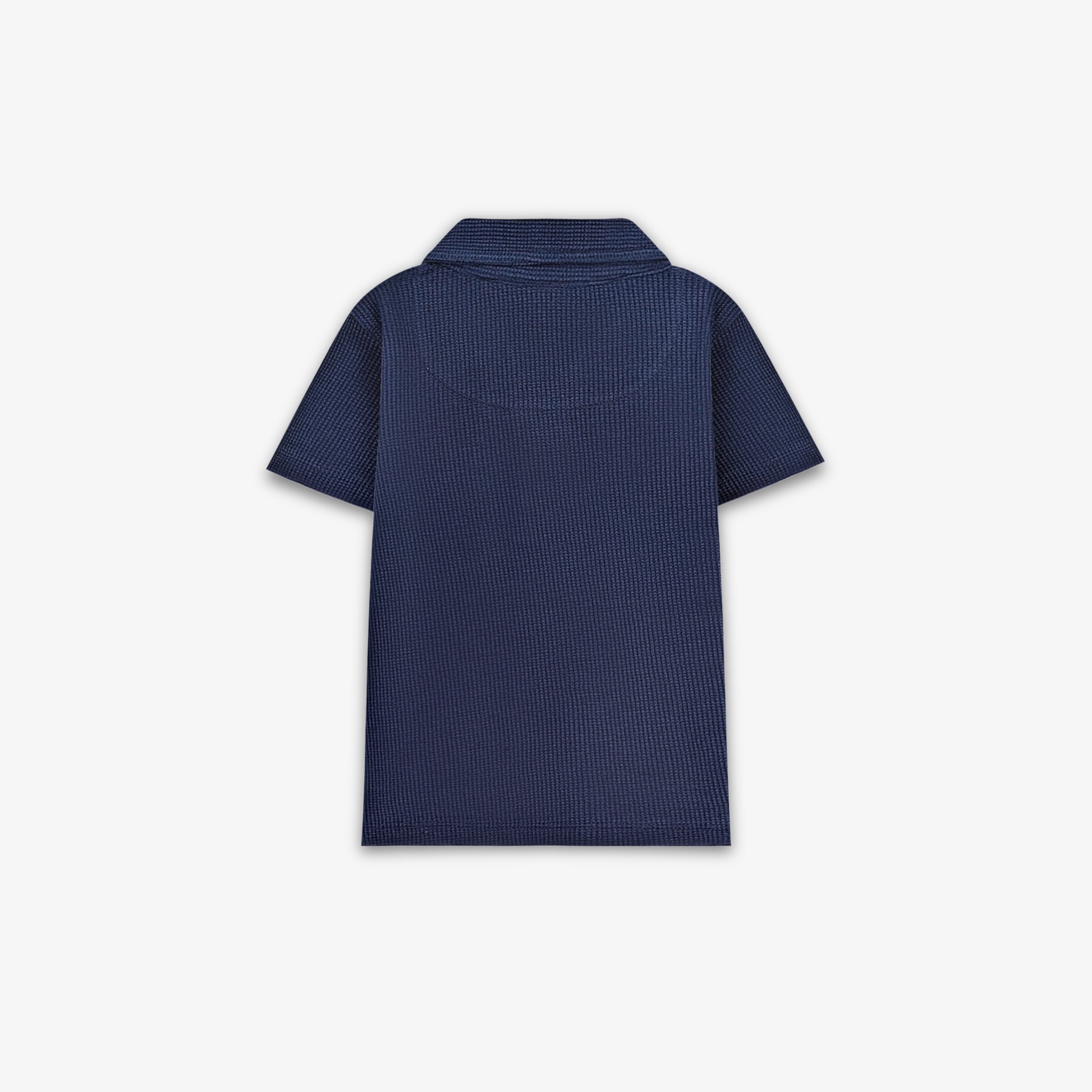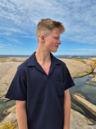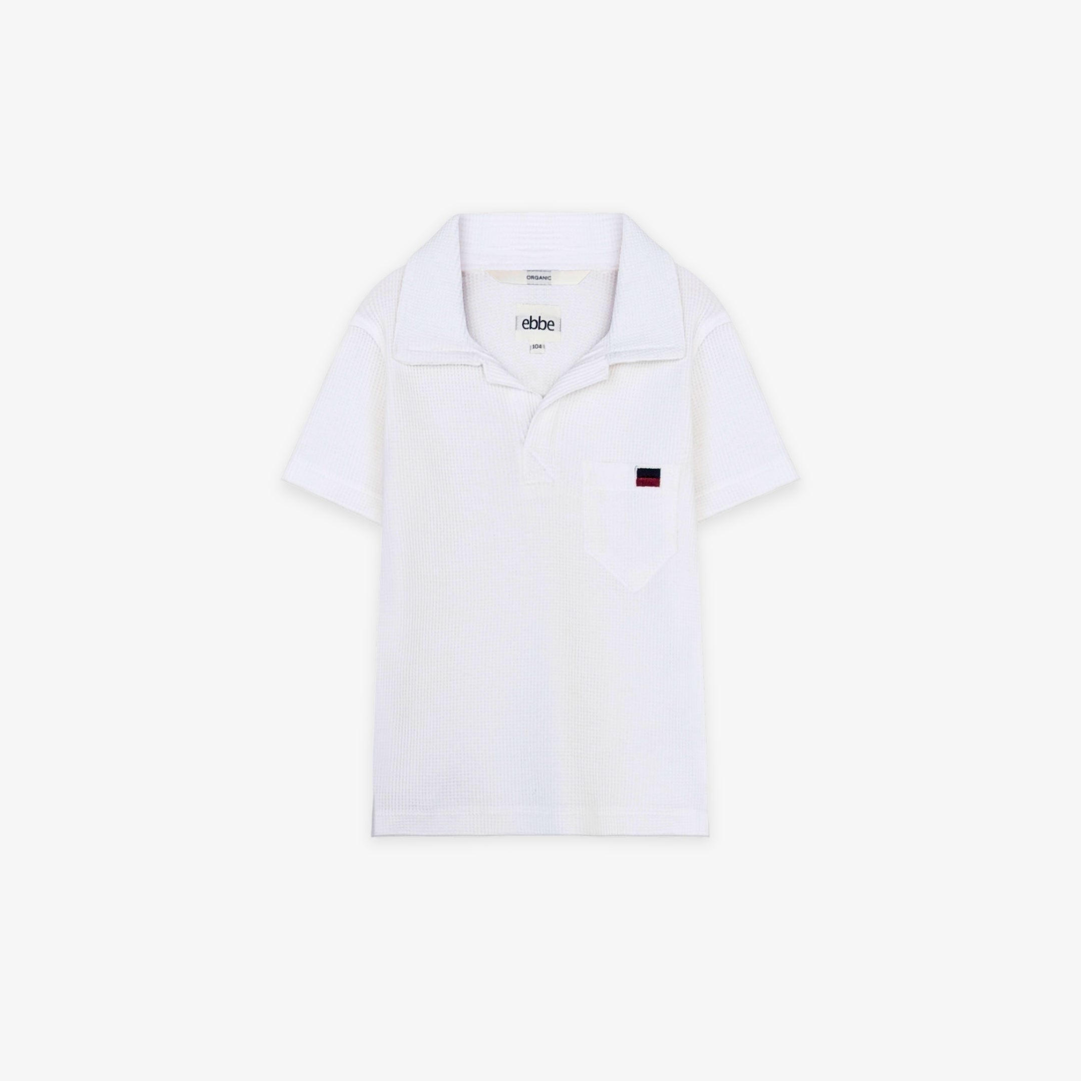 Kortärmad mjuk Waffle skjorta i bomull med en snygg krage. En ficka på bröstet med ett broderad signalflagga för bokstaven "e - som i ebbe". Bomullstyget är gjort som "Våffla" som är väldigt skönt och luftigt mot huden. Waffle är populärt tyg som känns "helt rätt" 2024-2025.
