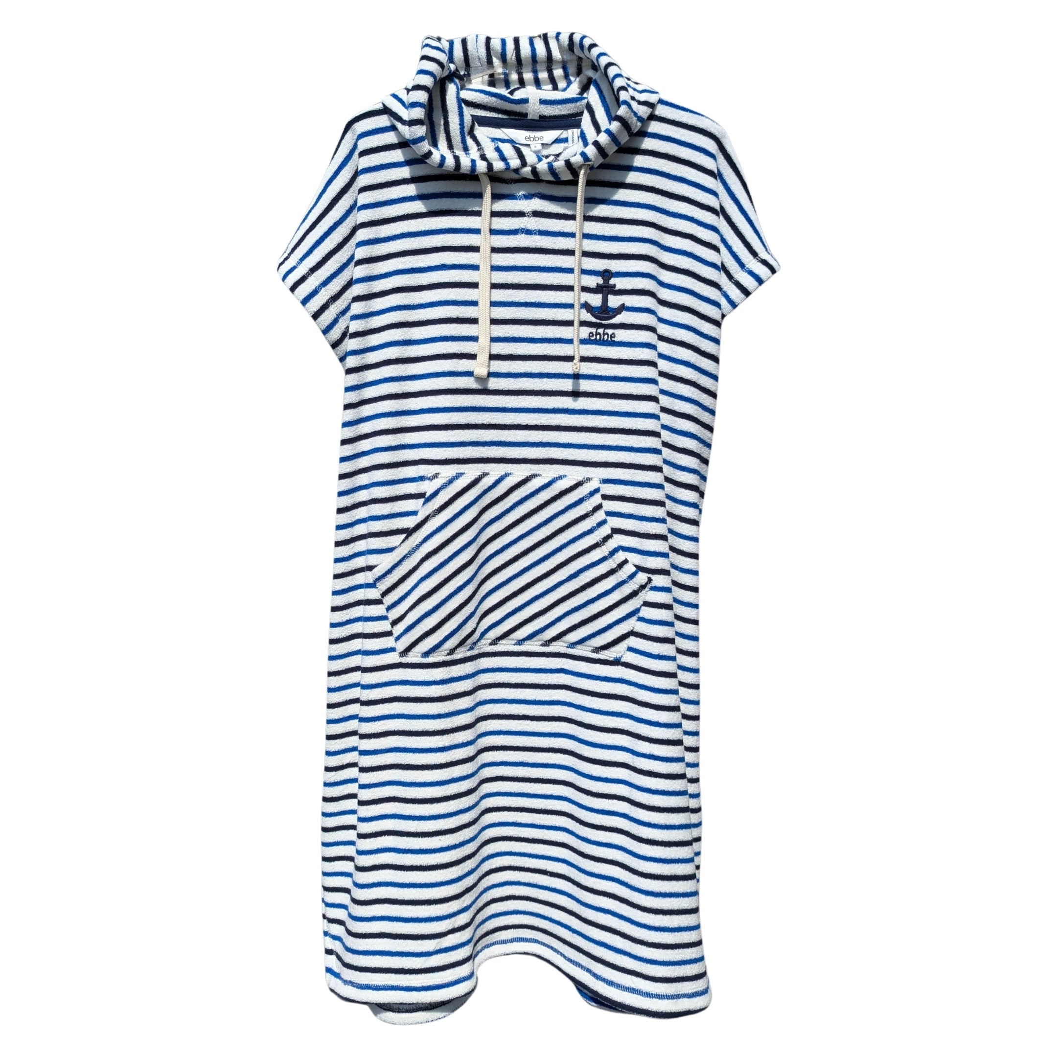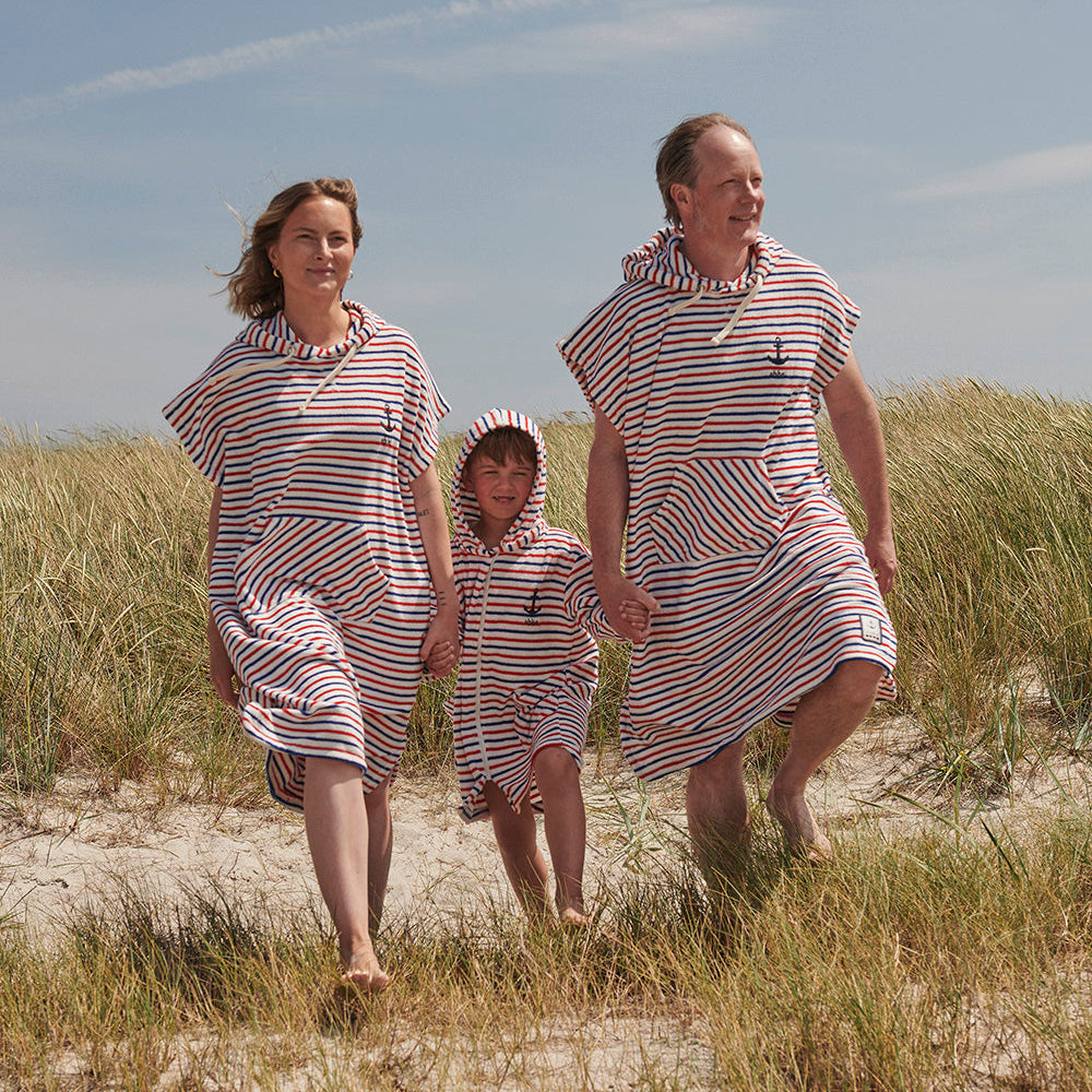 Badponcho till vuxen i trefärgad klassisk tricolourrand med dekorativt broderi på bröstet. Huva med dragsko och knytband och stor kangarooficka framtill. Tillverkad i dubbelsidig ekologisk bomullsfrotté och återvunnen polyester. Rundad nedtill med slits på sidorna. Perfekt att ha på sig efter bad eller dusch då den torkar snabbt, absorberar fukt och är mjuk och behaglig mot huden.