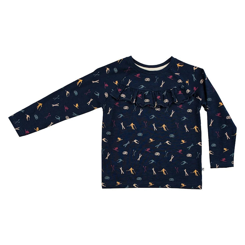 Långärmad mönstrad topp/tröja till barn med volang på bröst. Bandkantning i hals och tillverkad i mjuk slubtrikå av ekologisk bomull.