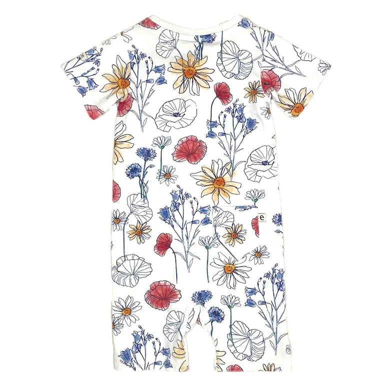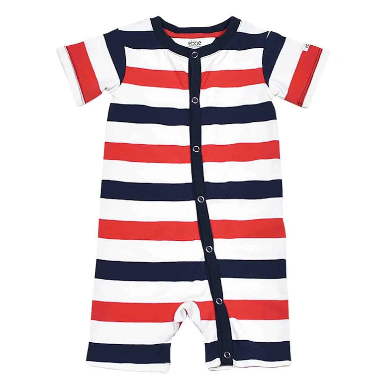 Kortärmad heldräkt med korta ben och en liten fin bakficka. Heldräkten har tryckknappar fram och längs ena benet för enkel på och avklädning. Tillverkad i mjuk trikå i ekologisk bomull.