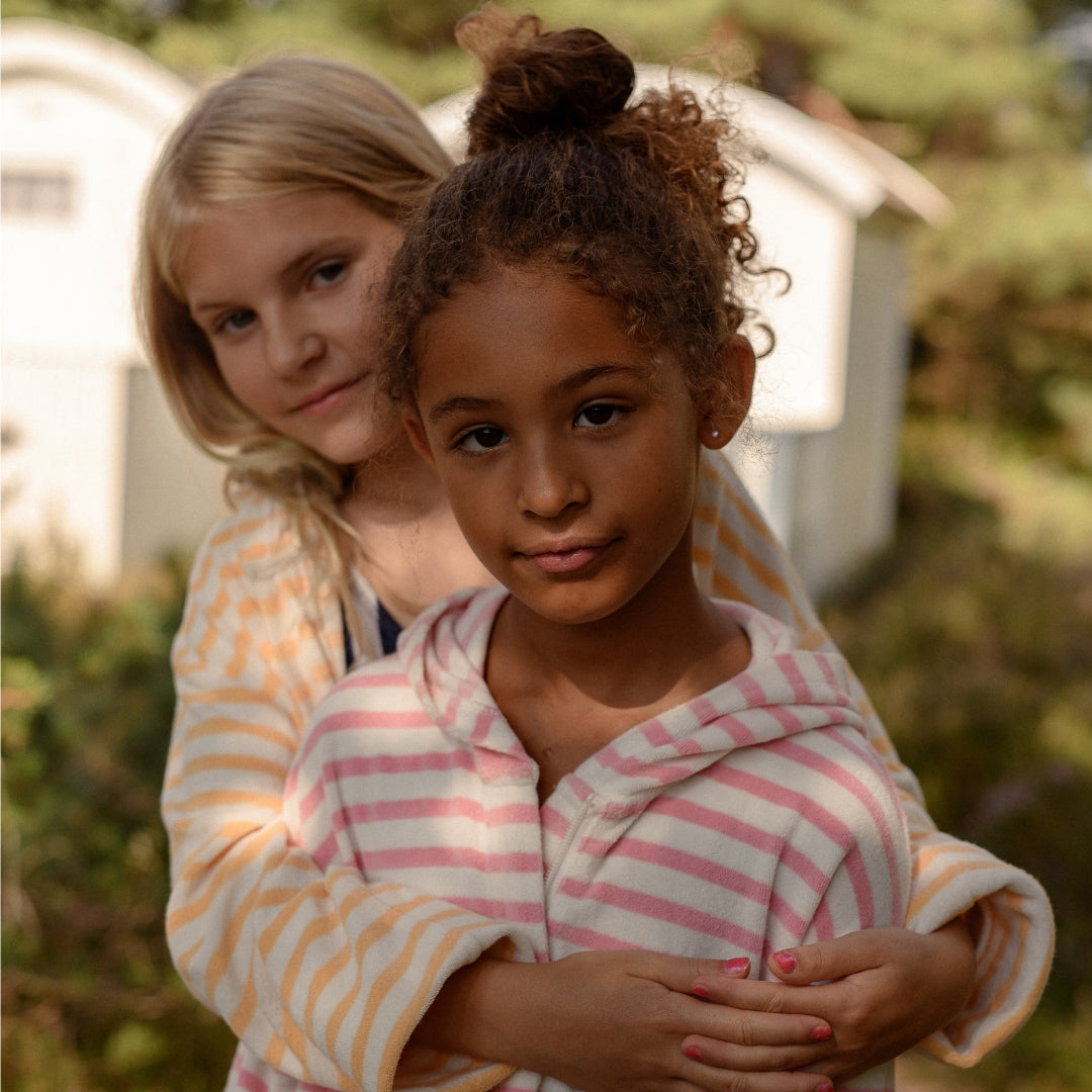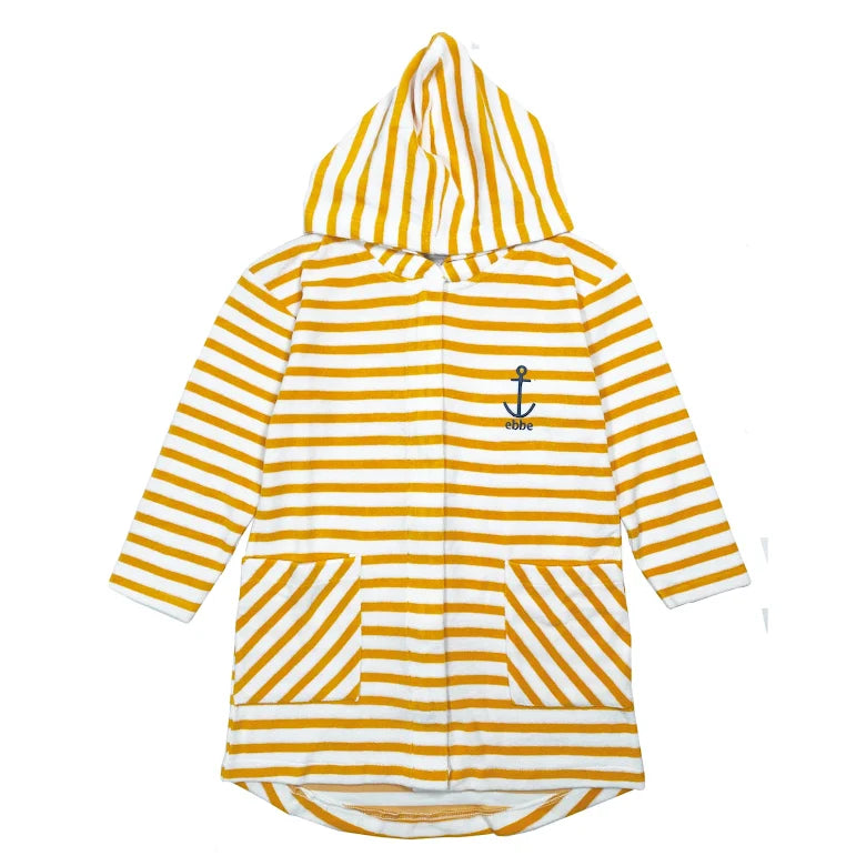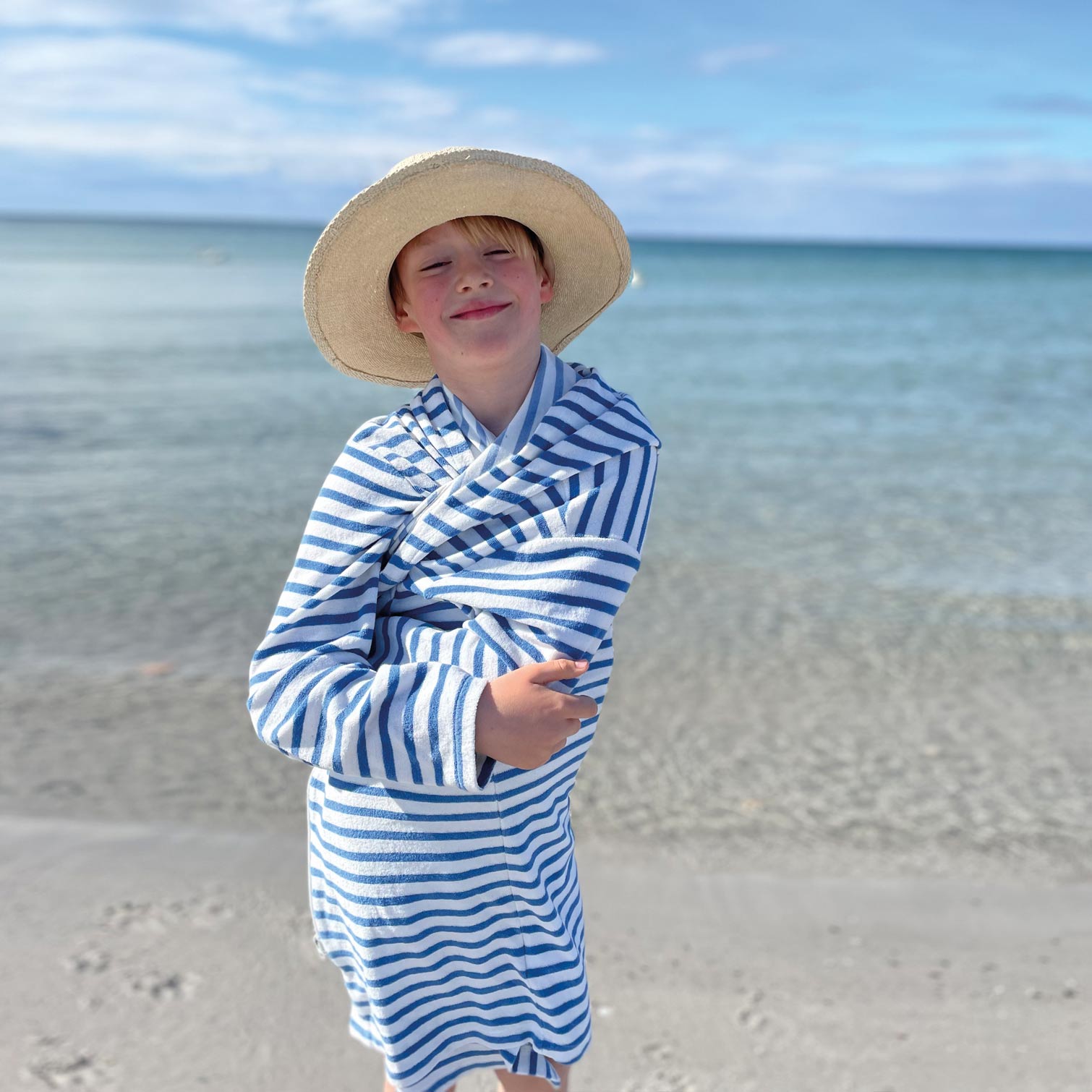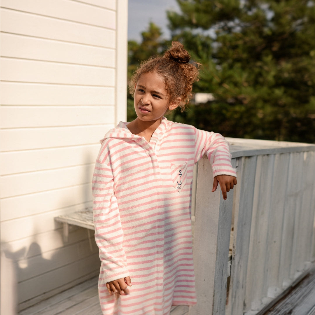 Badrock till barn i mjuk frotté i vår klassiska rand. Brodyr på bröstet och två rymliga fickor fram. Ledig modell med huva (avtagbar t.o.m storlek 128) och dragkedja fram. Hållbart tillverkad i ekologisk bomull och återvunnen polyester. Perfekt att svepa in sig i efter bad eller dusch.