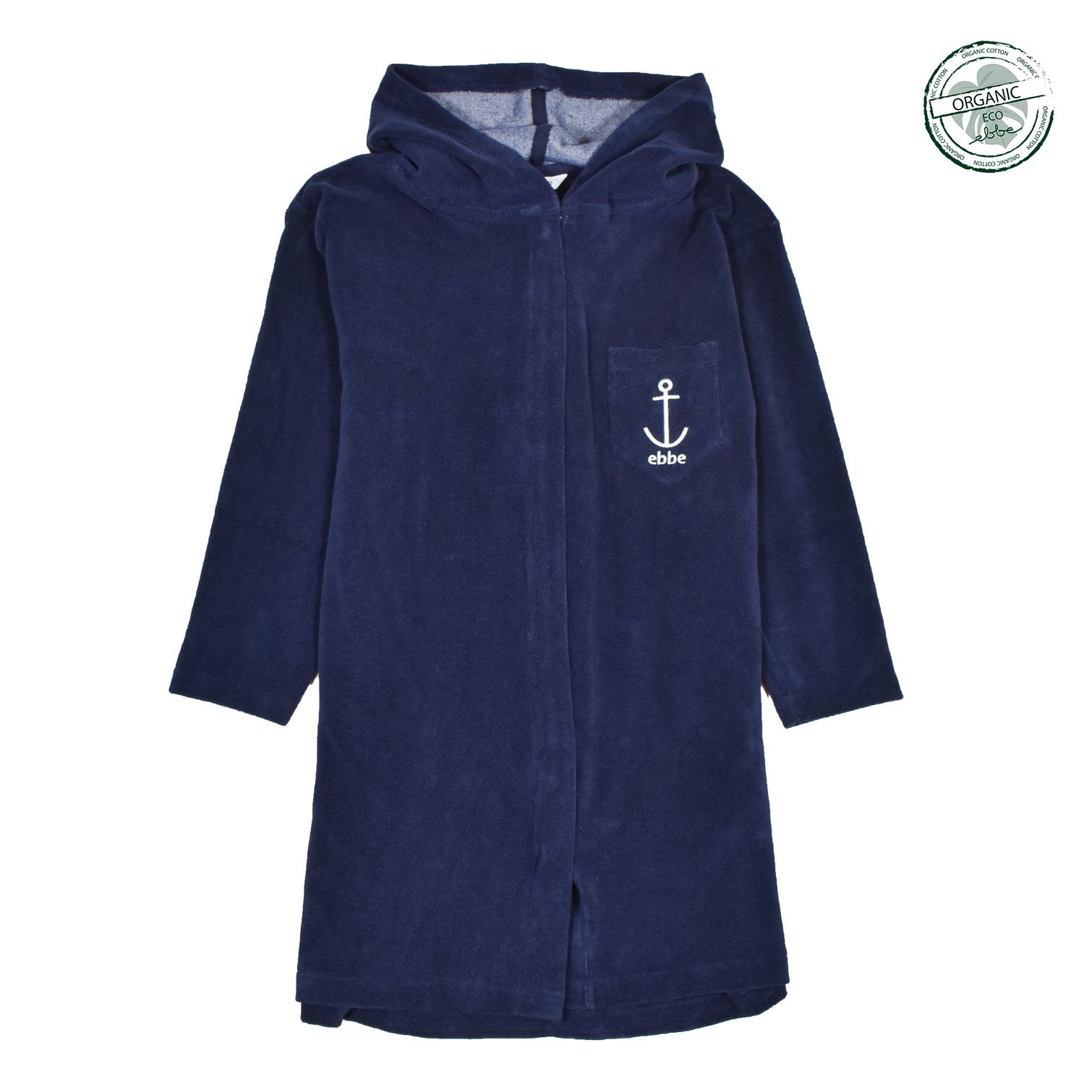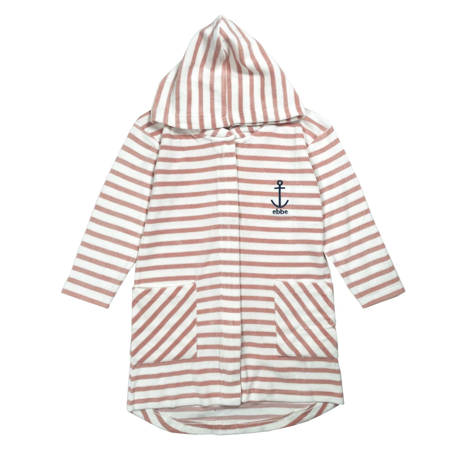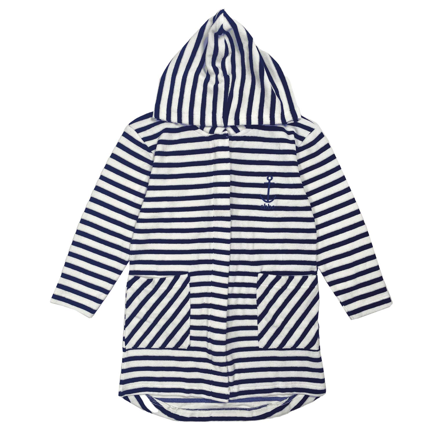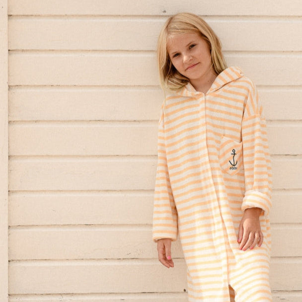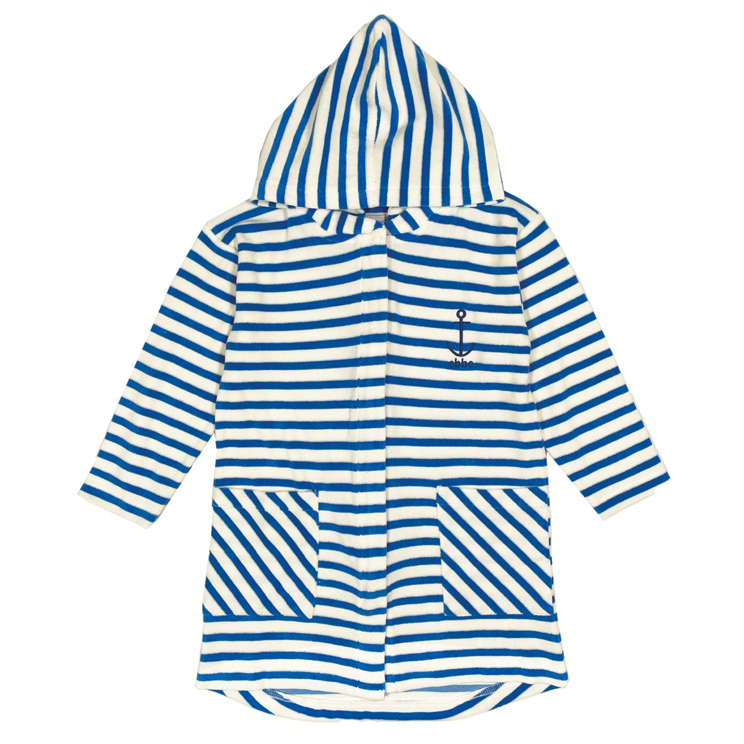 Badrock till barn i mjuk frotté i vår klassiska rand. Brodyr på bröstet och två rymliga fickor fram. Ledig modell med huva (avtagbar t.o.m storlek 128) och dragkedja fram. Hållbart tillverkad i ekologisk bomull och återvunnen polyester. Perfekt att svepa in sig i efter bad eller dusch.