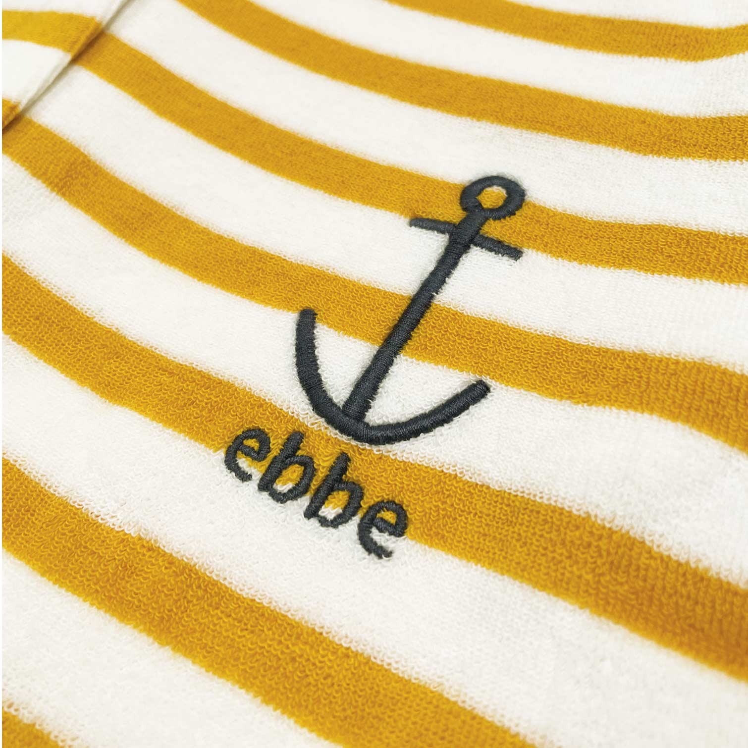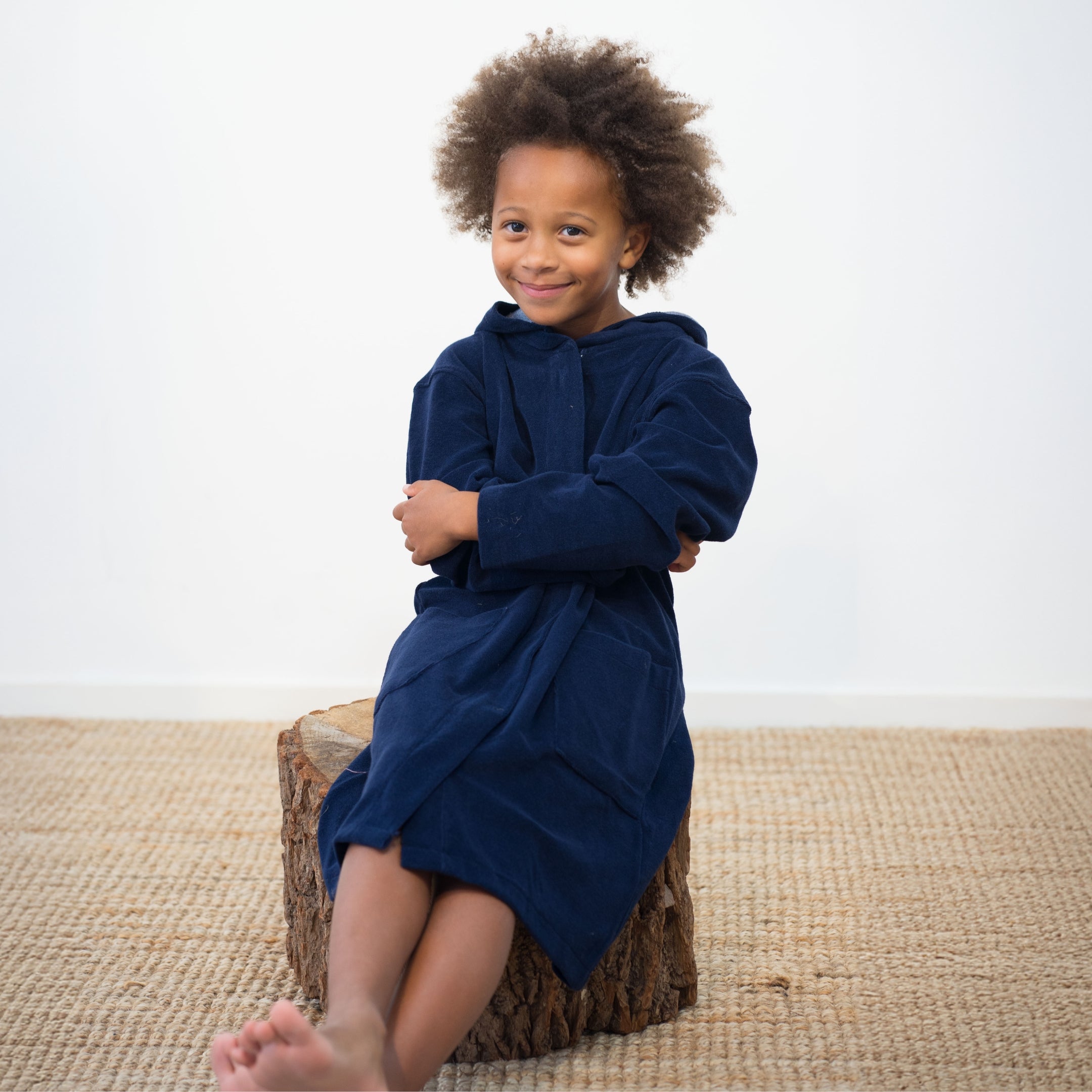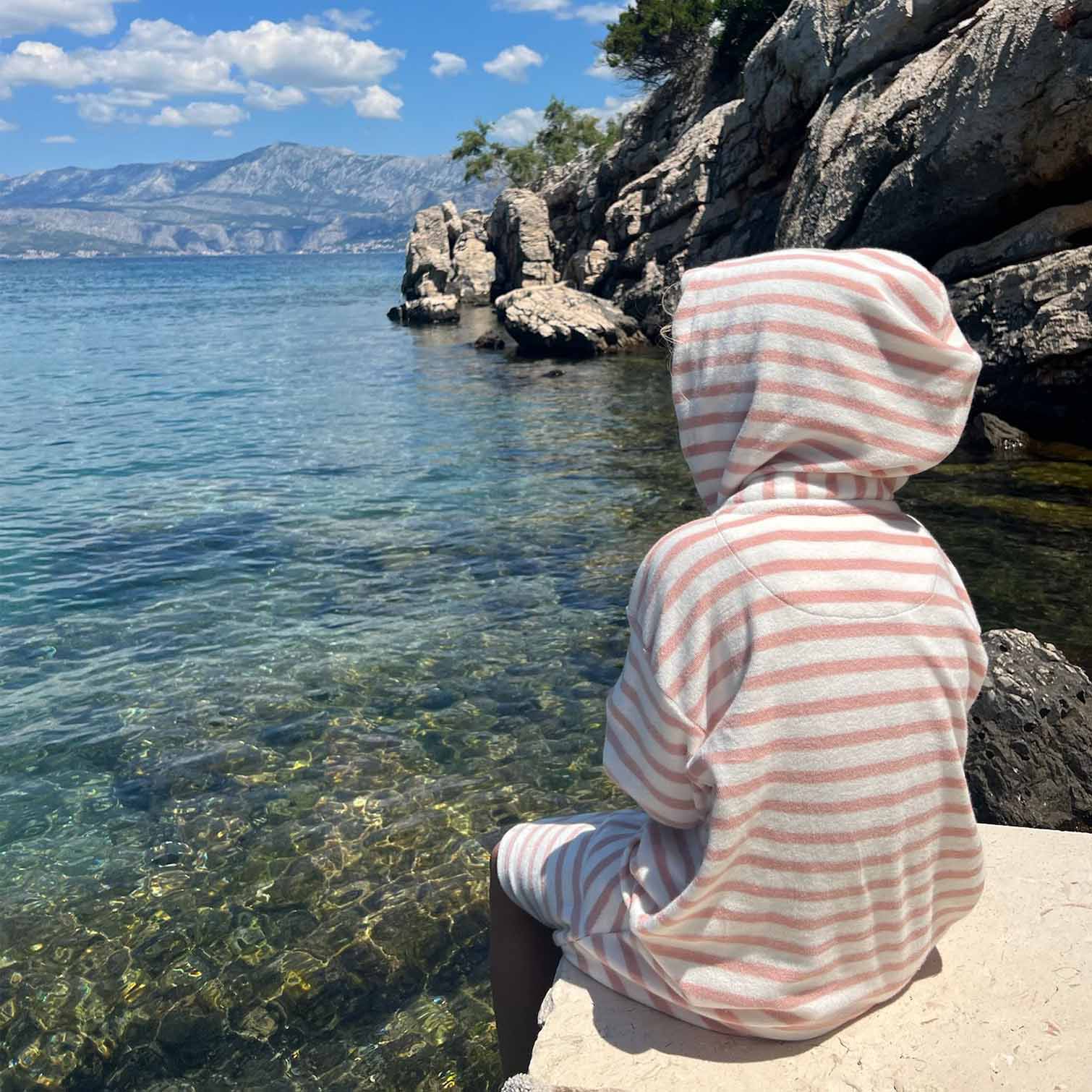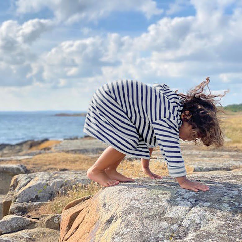 Badrock till barn i mjuk frotté i vår klassiska rand. Brodyr på bröstet och två rymliga fickor fram. Ledig modell med huva (avtagbar t.o.m storlek 128) och dragkedja fram. Hållbart tillverkad i ekologisk bomull och återvunnen polyester. Perfekt att svepa in sig i efter bad eller dusch.
