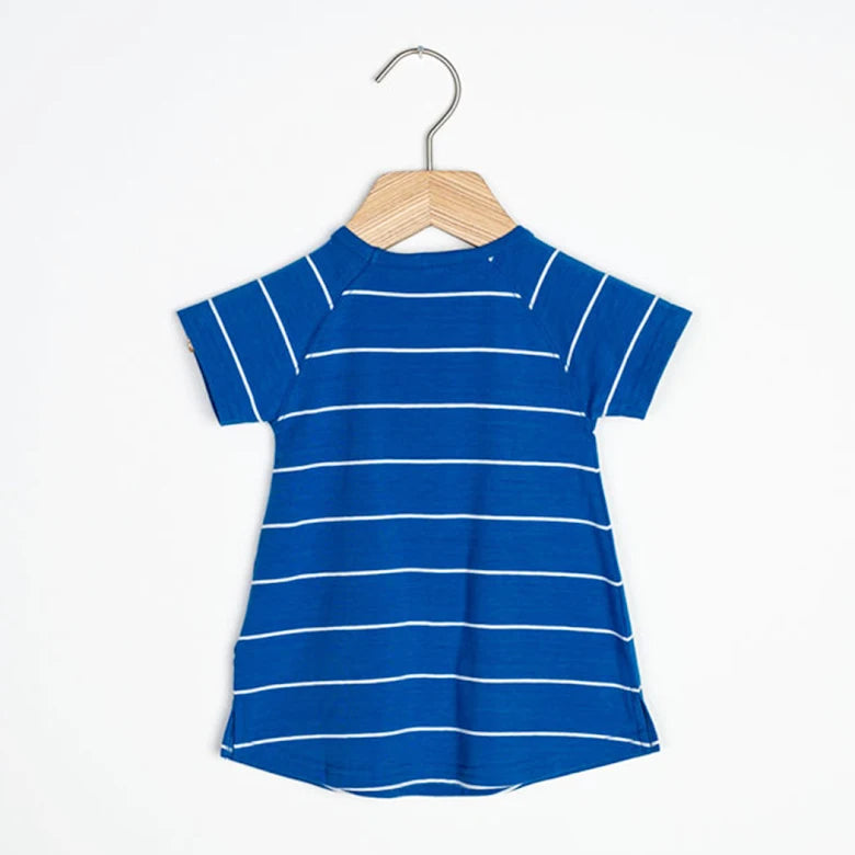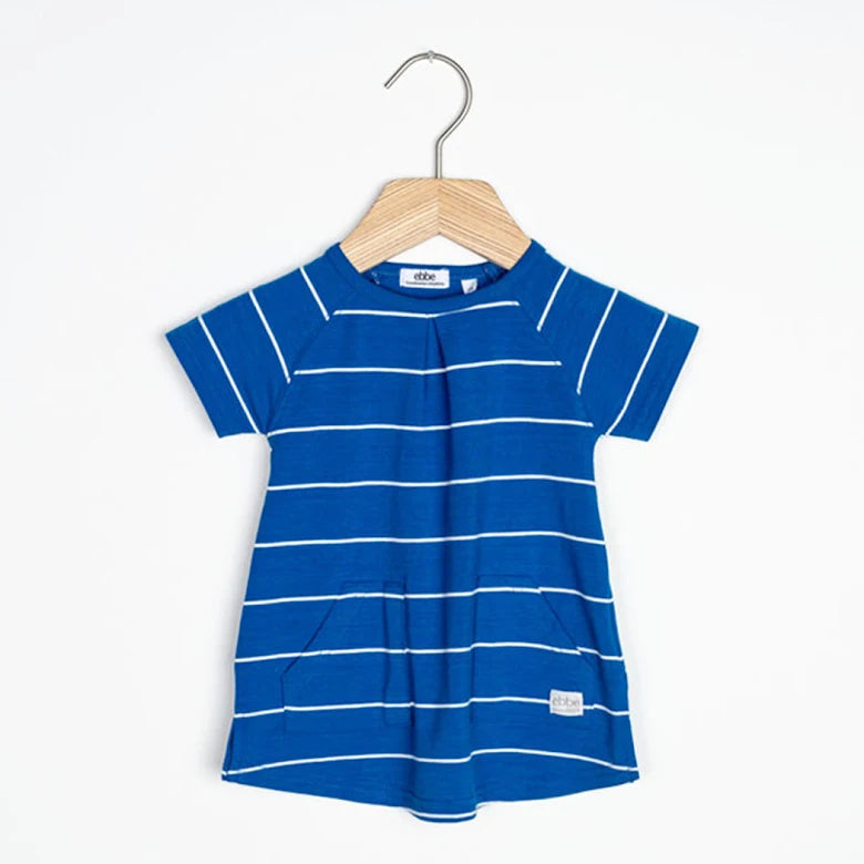 Kortärmad a-linjeformad klänning. Ledig modell med raglanärmhål och bandkantad kring hals. Knäppning på axel och fickor fram. Lätt rundad nedtill. Tillverkad i mjuk trikå i ekologisk bomull.