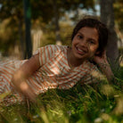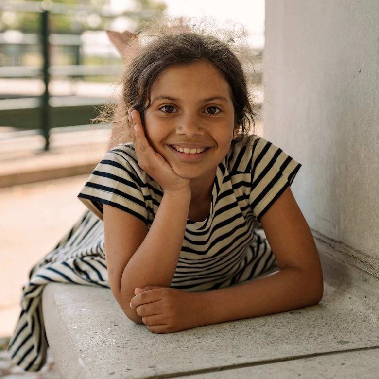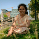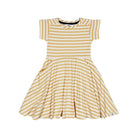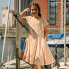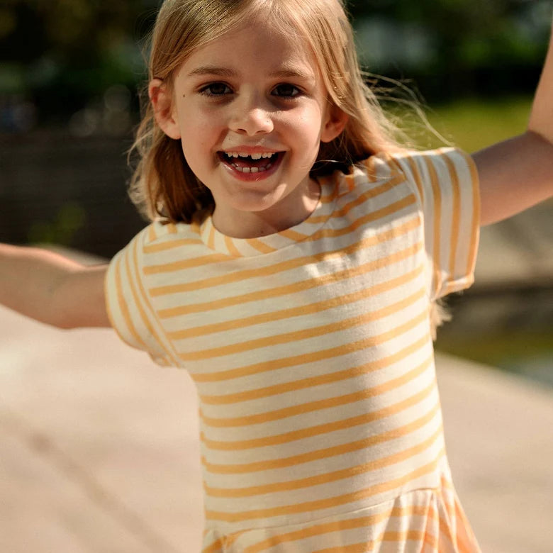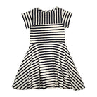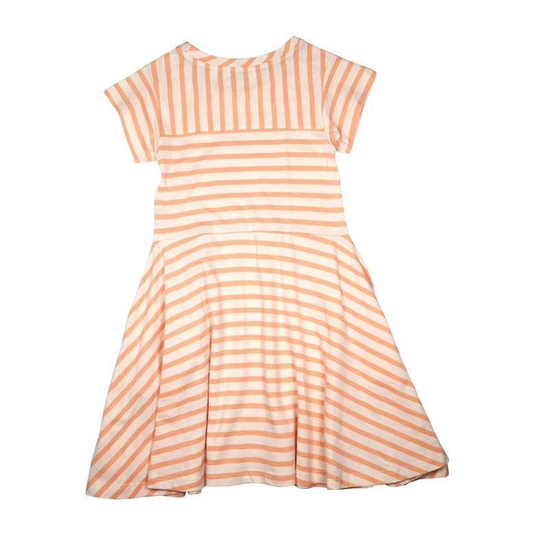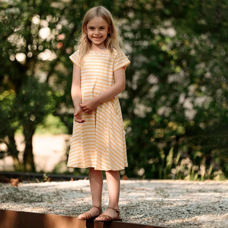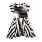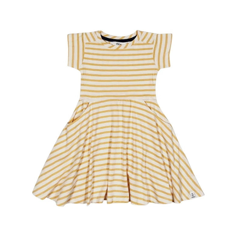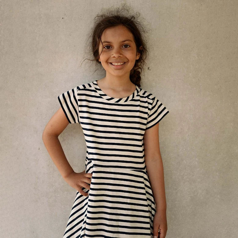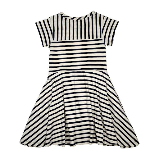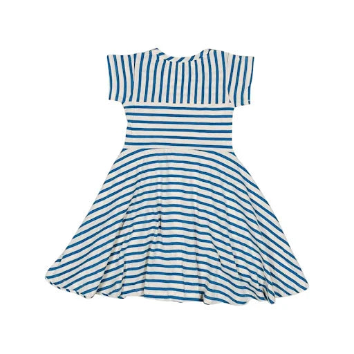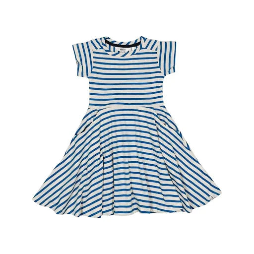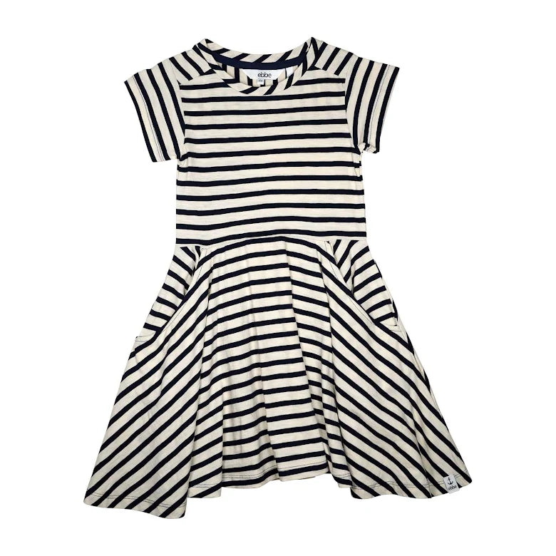 Klänning med klassiskt mörkblå ränder, markerad midja och mycket vidd i kjolen som ger ett fint "snurr". Rundad halslinning, kort ärm och fickor i sidan.