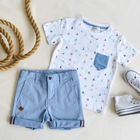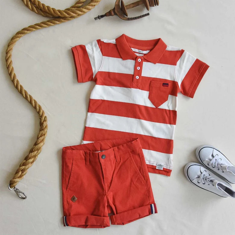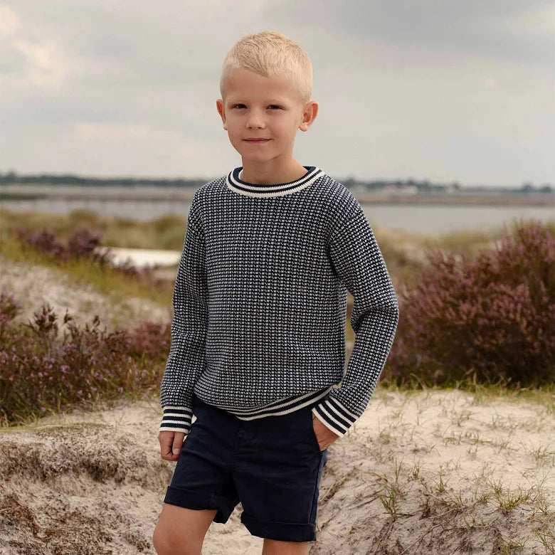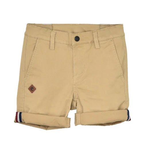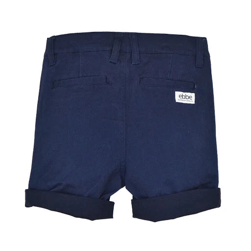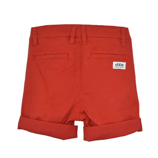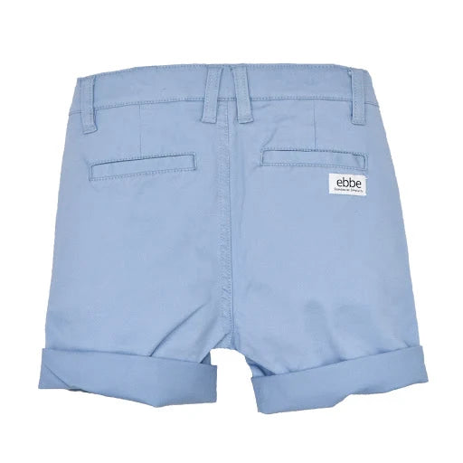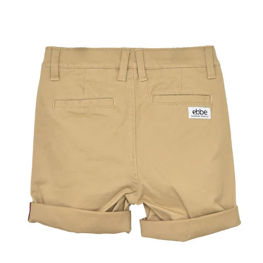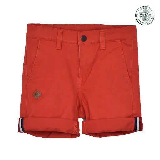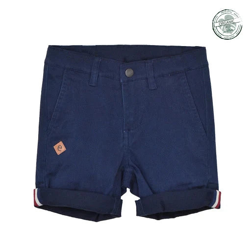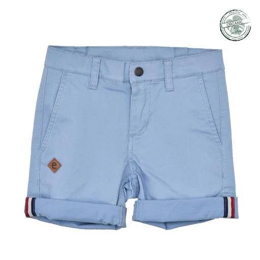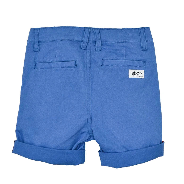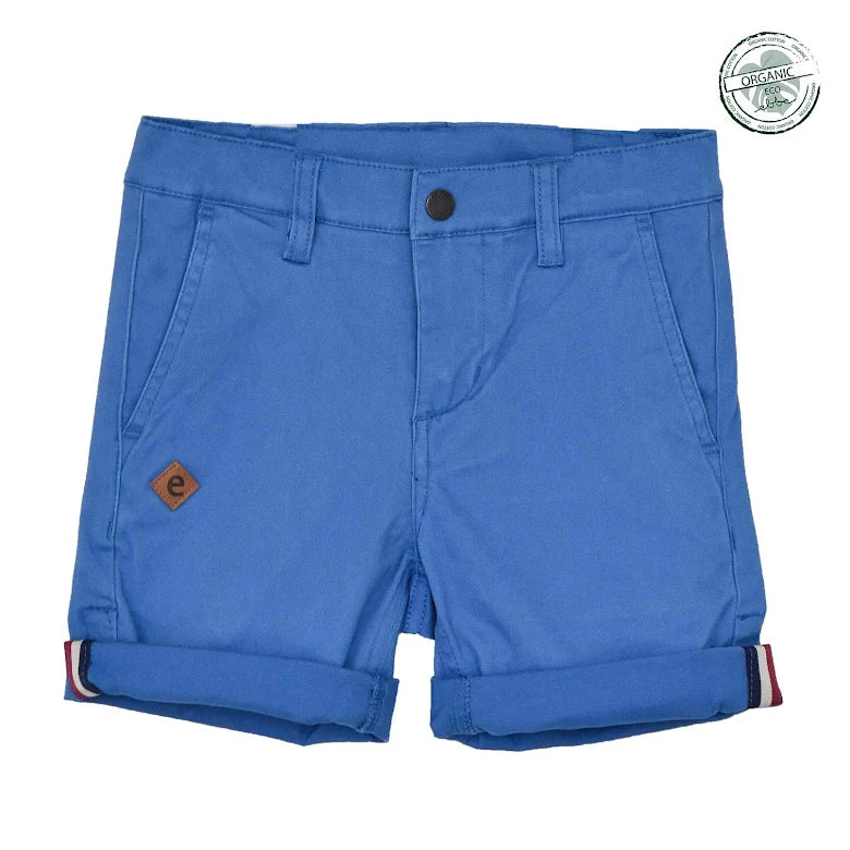 Chinosshorts till barn i klassisk modell med fickor i sidorna fram och passpoalfickor bak. Justerbar resår i midja och tryckknapp med blixtlås fram för enkel användning. Dekorativ etikett i läderimitation vid ena fickan. Rulla gärna upp benslut för en ”casual look”. Tillverkad i mjukt, stretchigt twilltyg av ekologisk bomull.