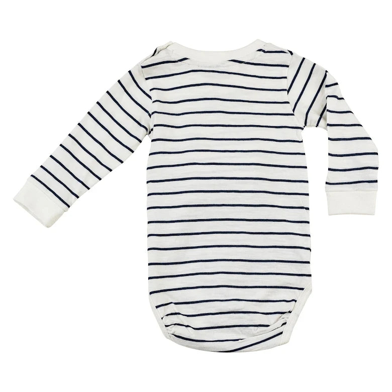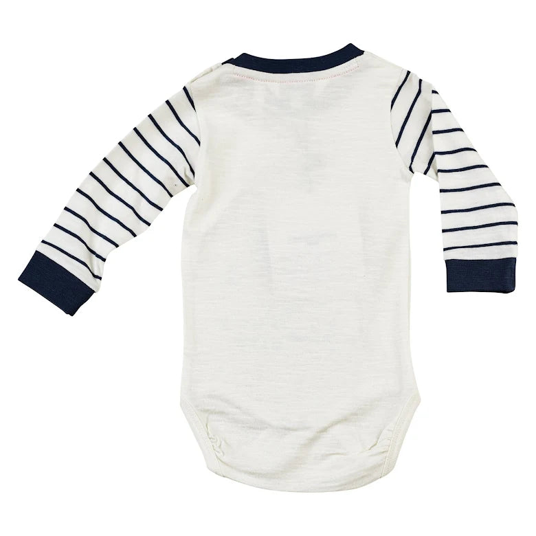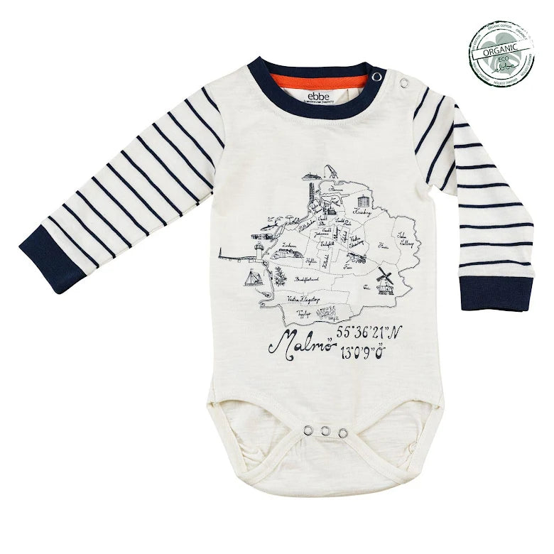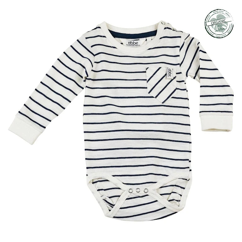 Långärmad body till baby med härligt marint uttryck och bröstficka med tryck. Tryckknappar i axel och gren förenklar av- och påklädningen och elasticitet i benslut för bästa komfort. Bodyn är hållbart tillverkad i 100% ekologisk bomull.