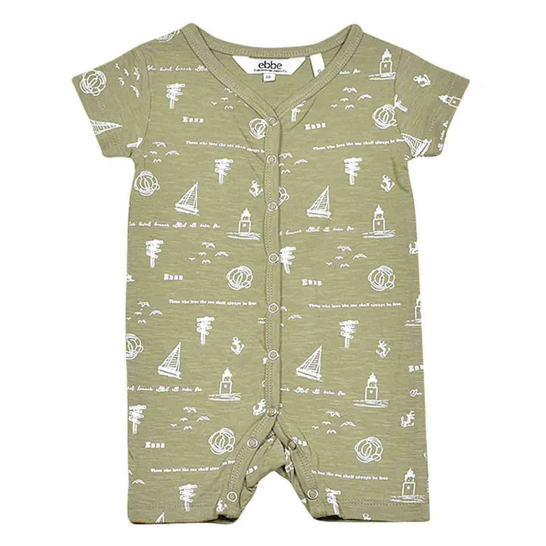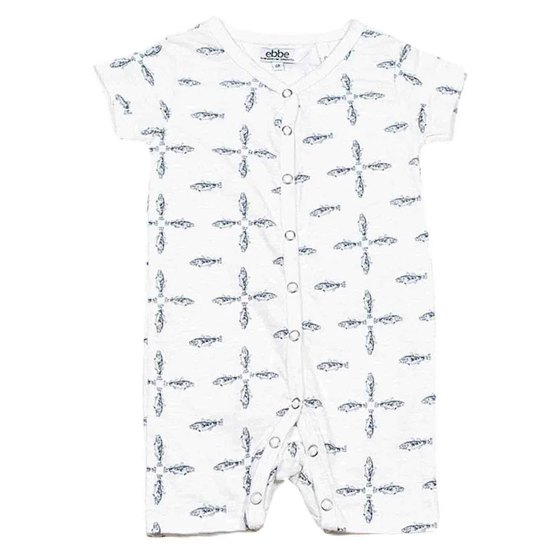Kortärmad heldräkt med korta ben med två små bakfickor. Heldräkten har tryckknappar fram och längs ena benet för enkel på och avklädning. Tillverkad i ekologisk bomull.