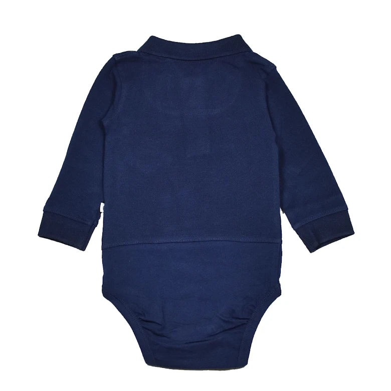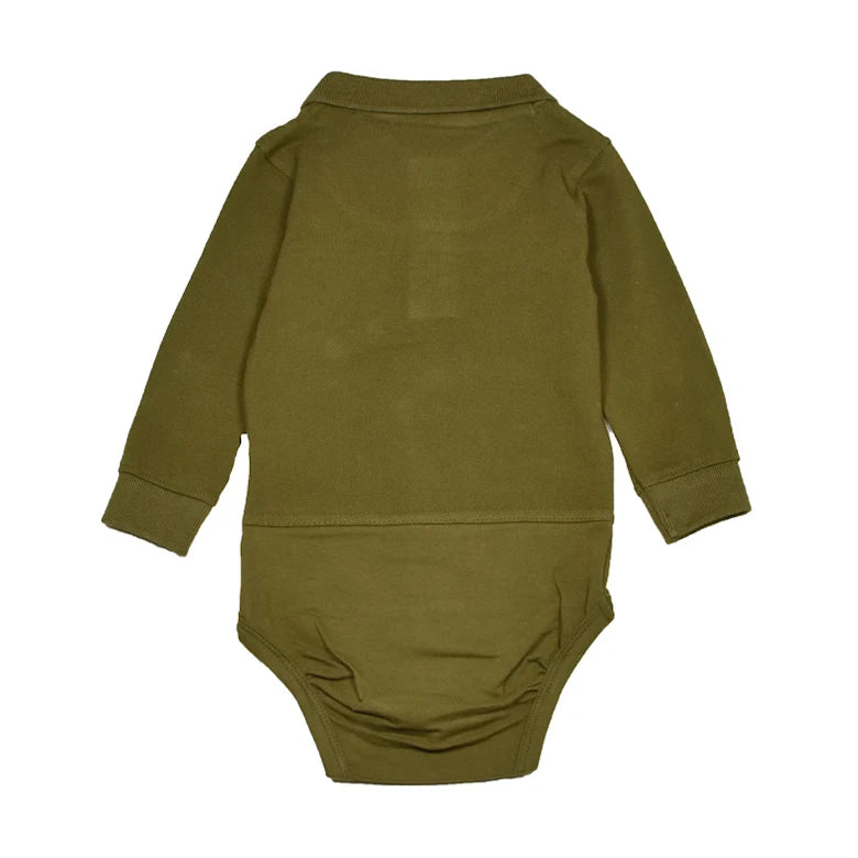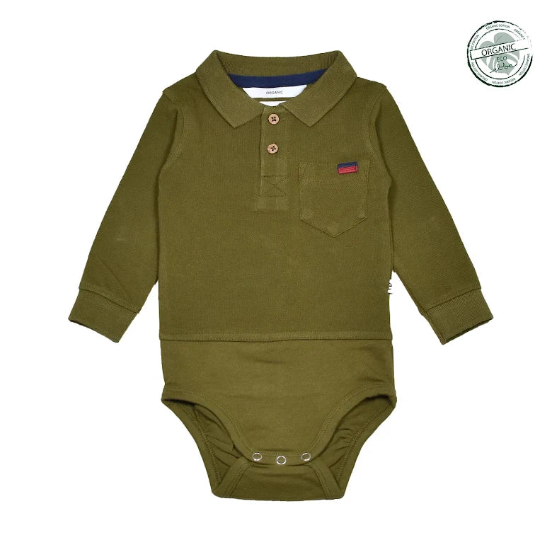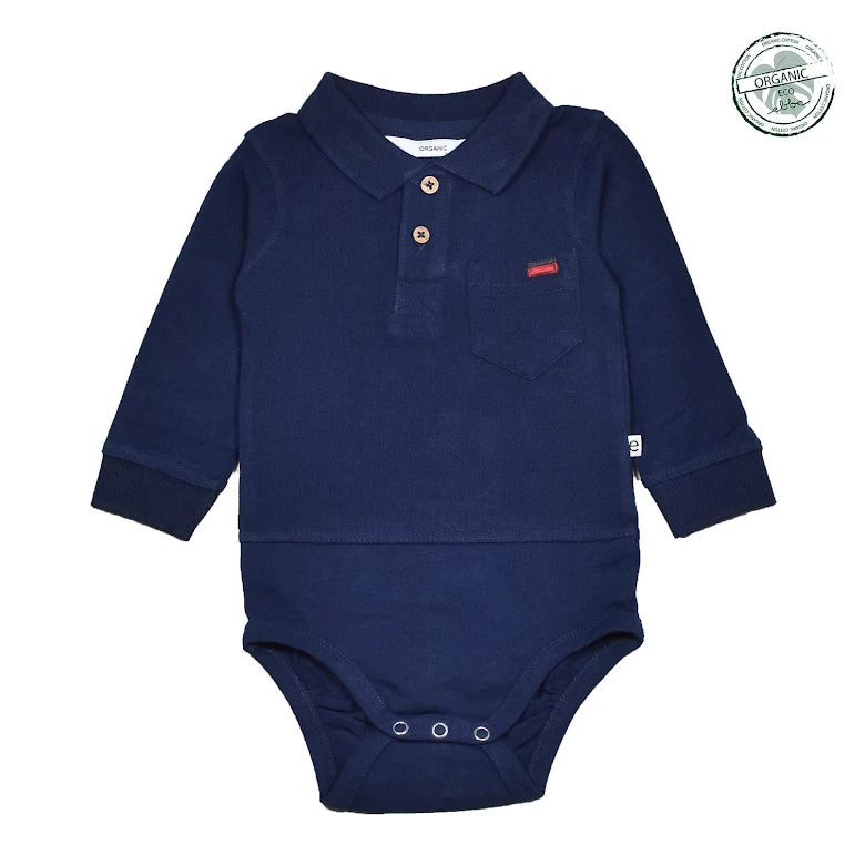 Body för baby i mjuk och skön pikékvalitet i sobra färger. Bodyn har långa ärmar och en nederdel av stretchigt jerseytyg för extra bekväm passform. En fin krage med knappar fram samt en bröstficka med broderi. Perfekt att matcha med små chinos för ett "dressat" intryck. Tryckknappar i grenen för enkel på- och avklädning. Hållbart tillverkad i 100% ekologisk bomull.